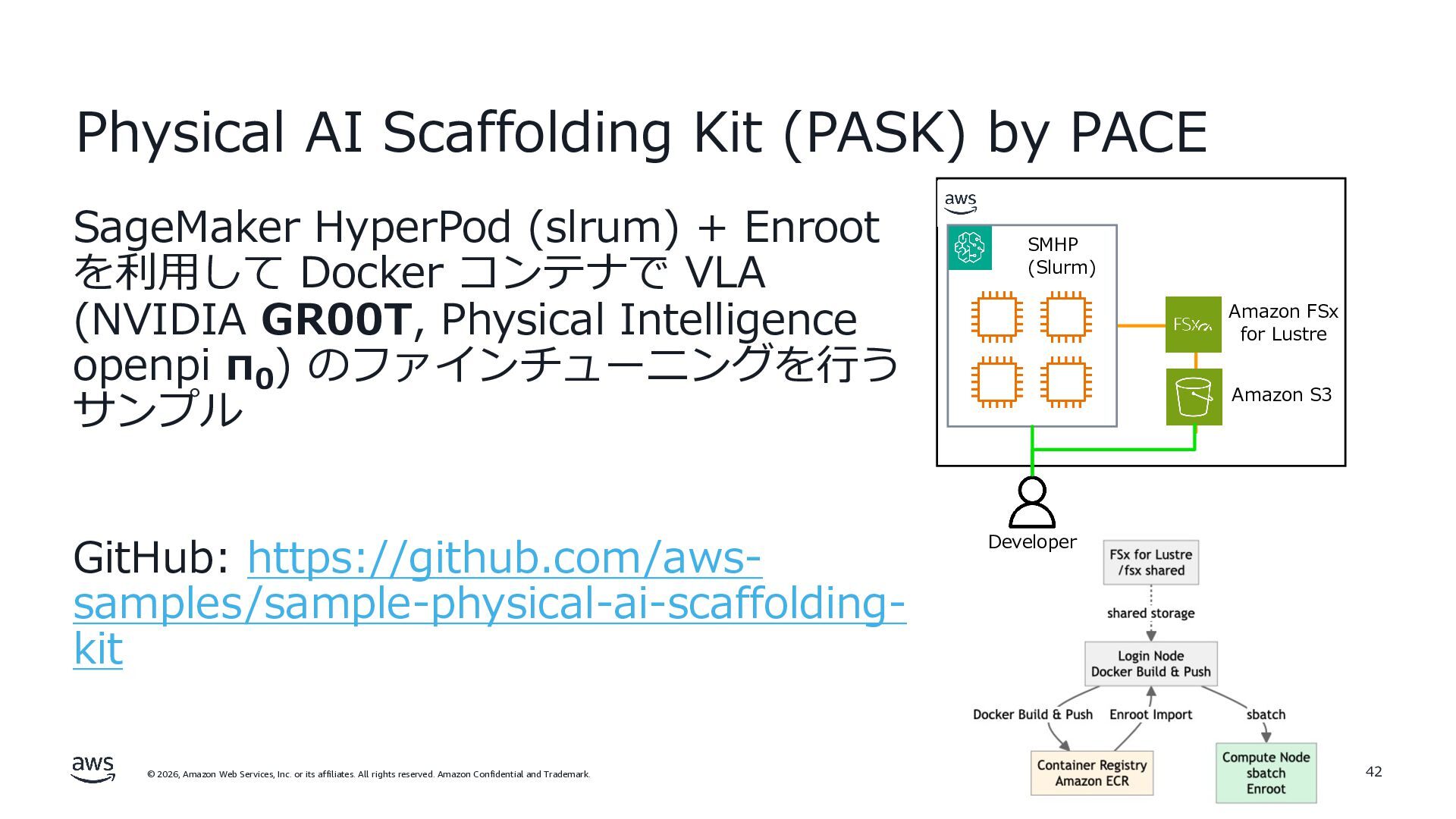 rights reserved. Amazon Confidential and Trademark. Physical AI Scaffolding Kit (PASK) by PACE SageMaker HyperPod (slrum) + Enroot を利⽤して Docker コンテナで VLA (NVIDIA GR00T, Physical Intelligence openpi π0 ) のファインチューニングを⾏う サンプル GitHub: https://github.com/aws- samples/sample-physical-ai-scaffolding- kit 42 AWS Cloud SMHP (Slurm) Amazon FSx for Lustre Amazon S3 Developer