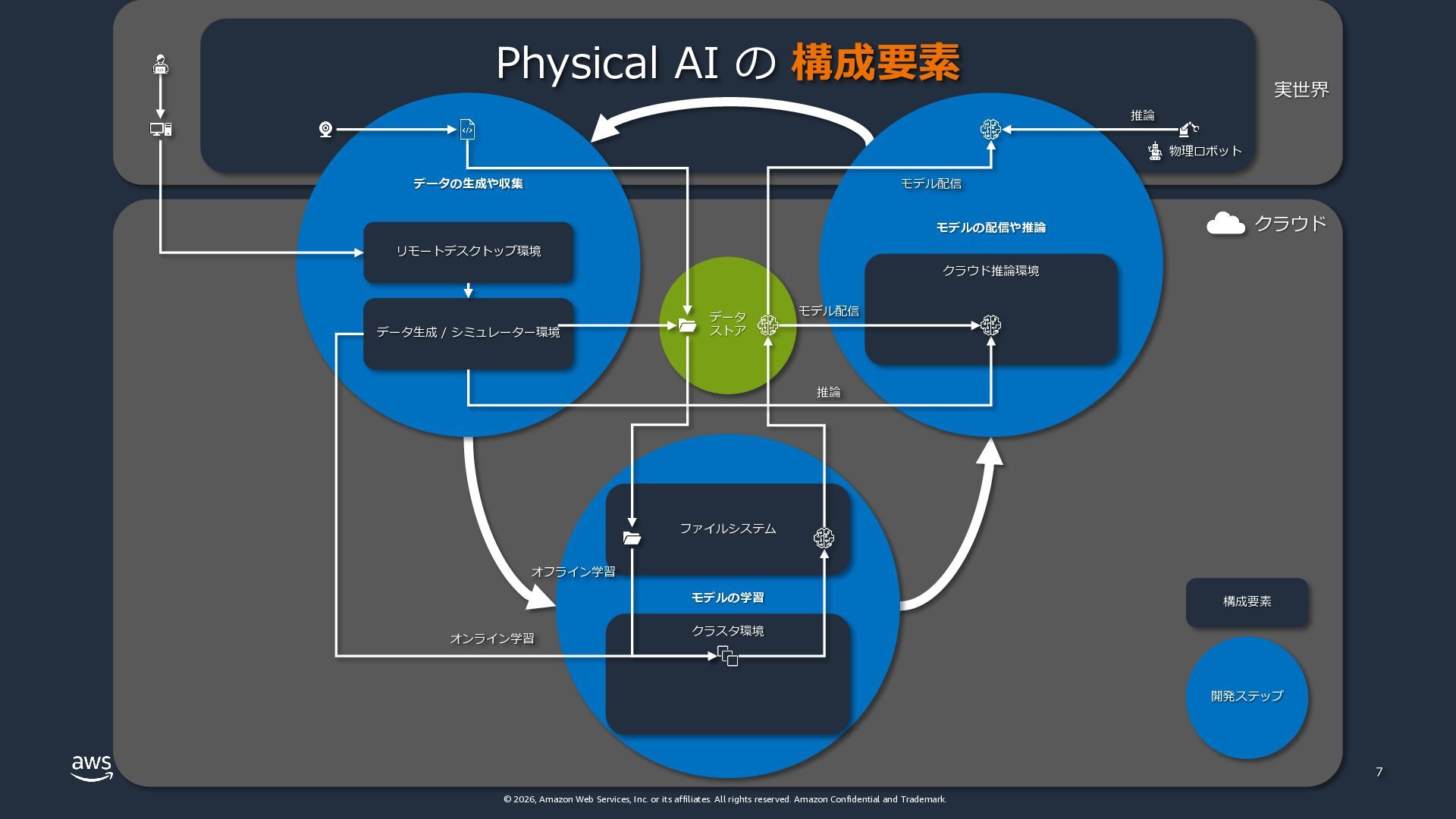 rights reserved. Amazon Confidential and Trademark. クラウド 実世界 6 モデル配信 Physical AI の開発 ステップ と サイクル データの ⽣成や収集 モデルの学習 モデルの 配信や推論 開発ステップ