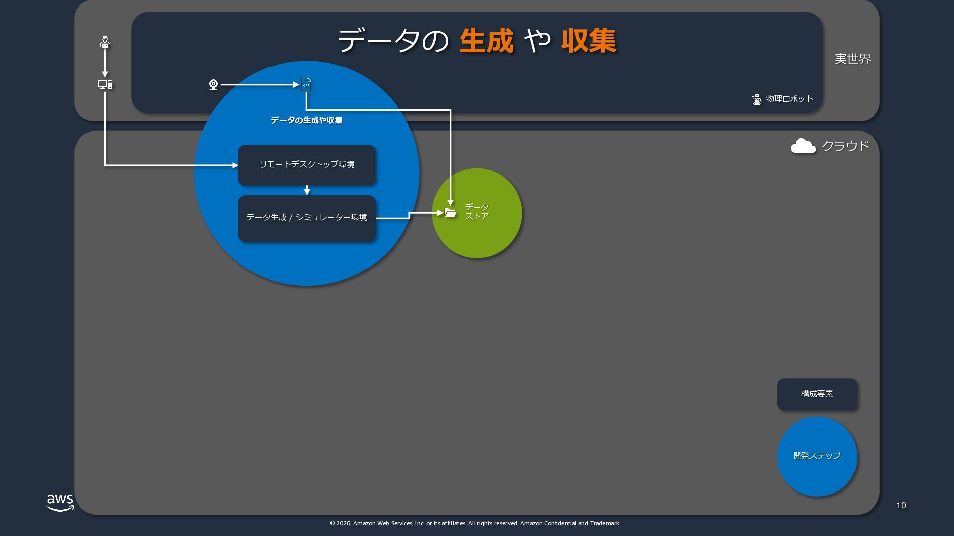 rights reserved. Amazon Confidential and Trademark. 9 Physical AI の開発 ステップ と サイクル データの ⽣成や収集 モデルの学習 モデルの 配信や推論