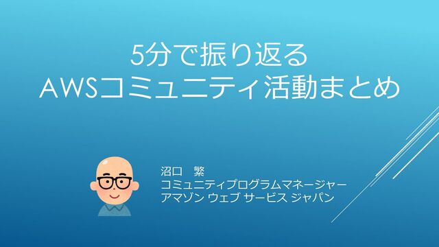 5分で振り返る AWSコミュニティ活動まとめ 沼口 繁 コミュニティプログラムマネージャー アマゾン ウェブ サービス ジャパン