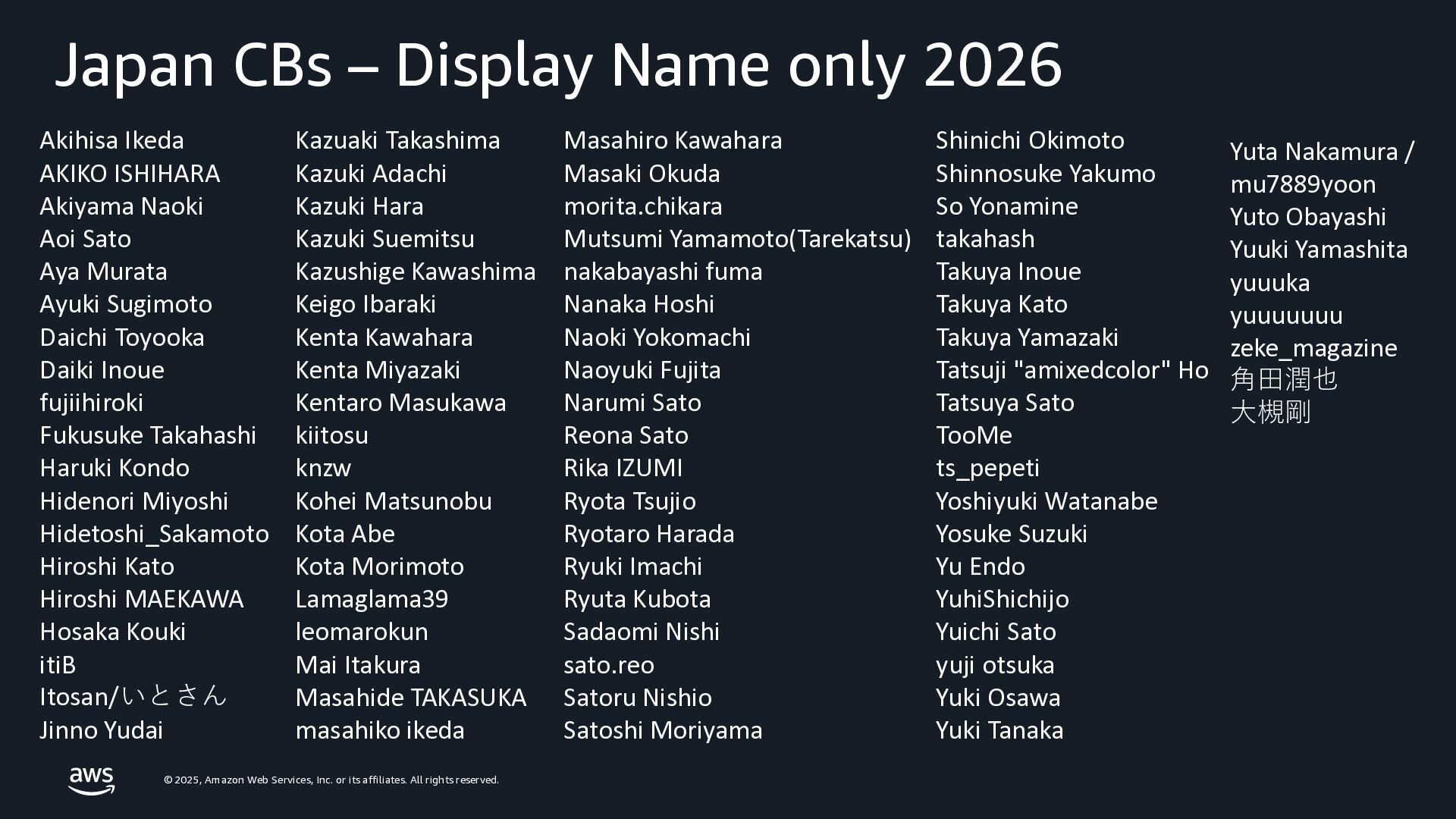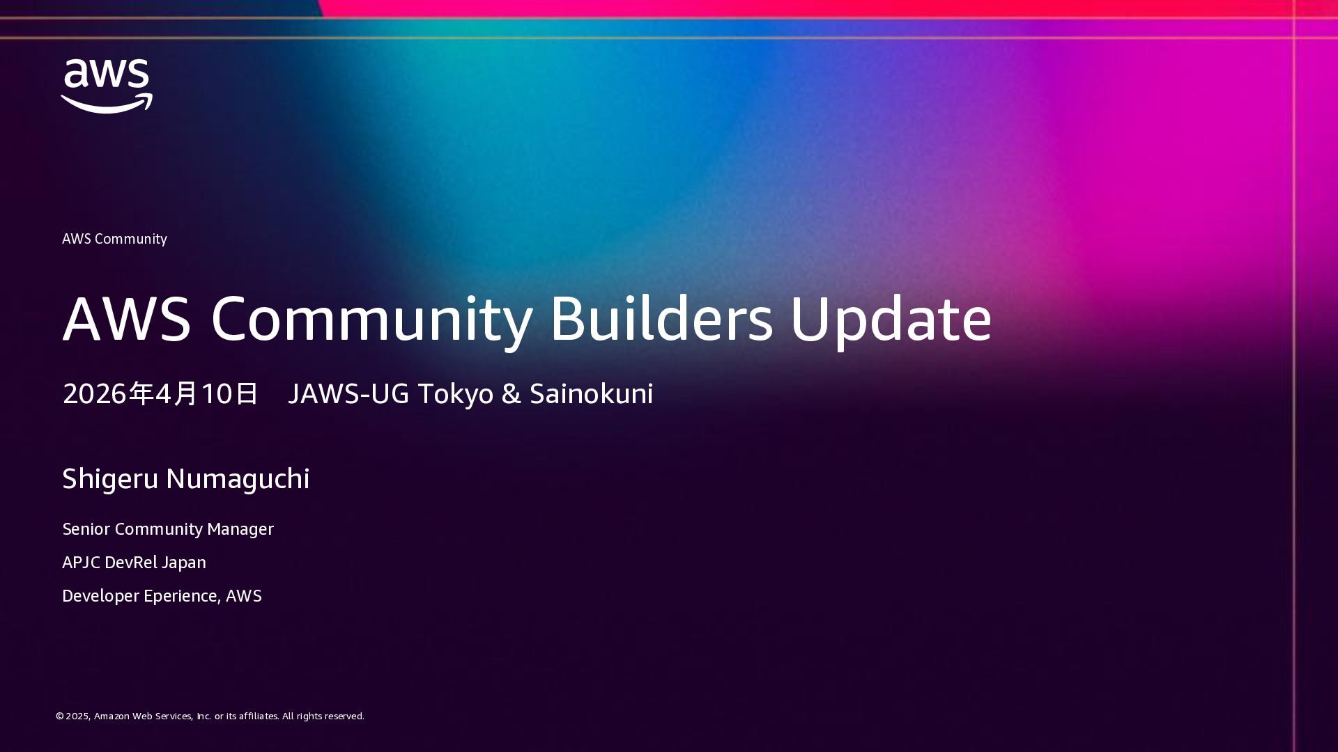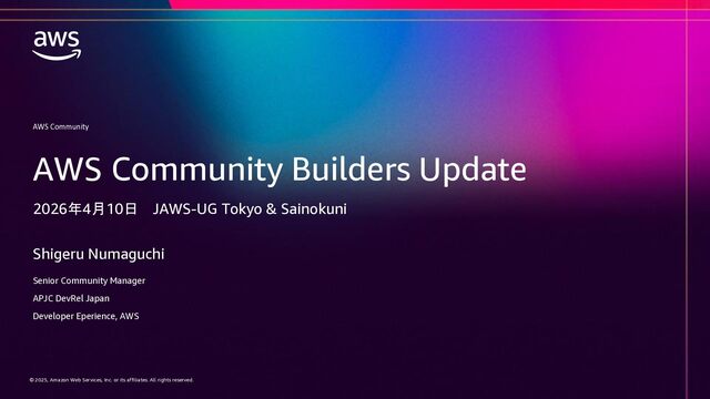 rights reserved. © 2025, Amazon Web Services, Inc. or its affiliates. All rights reserved. AWS Community Shigeru Numaguchi Senior Community Manager APJC DevRel Japan Developer Eperience, AWS AWS Community Builders Update 2026年4月10日 JAWS-UG Tokyo & Sainokuni