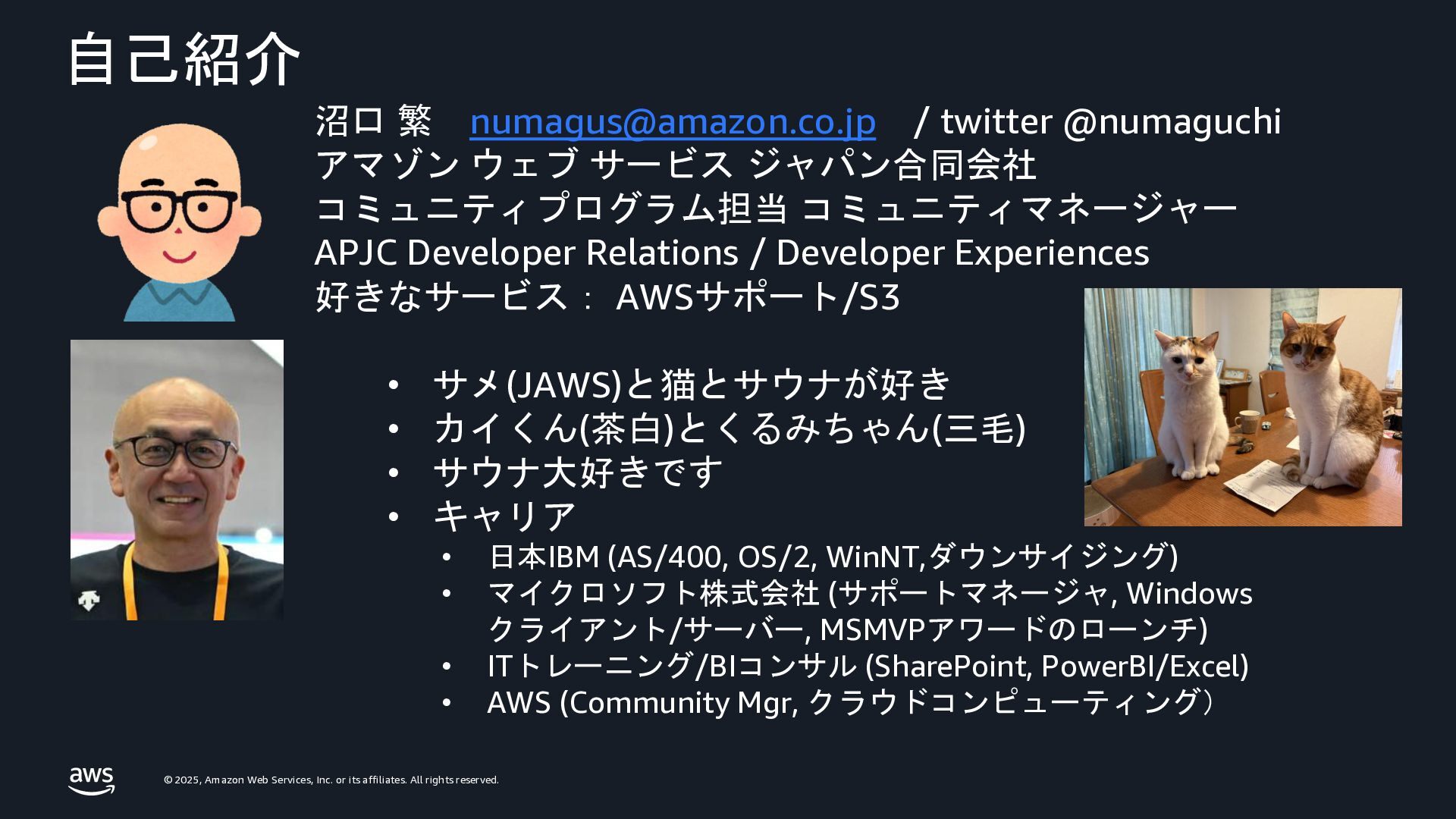 / twitter @numaguchi アマゾン ウェブ サービス ジャパン合同会社 コミュニティプログラム担当 コミュニティマネージャー APJC Developer Relations / Developer Experiences 好きなサービス: AWSサポート/S3 • サメ(JAWS)と猫とサウナが好き • カイくん(茶白)とくるみちゃん(三毛) • サウナ大好きです • キャリア • 日本IBM (AS/400, OS/2, WinNT,ダウンサイジング) • マイクロソフト株式会社 (サポートマネージャ, Windows クライアント/サーバー, MSMVPアワードのローンチ) • ITトレーニング/BIコンサル (SharePoint, PowerBI/Excel) • AWS (Community Mgr, クラウドコンピューティング)