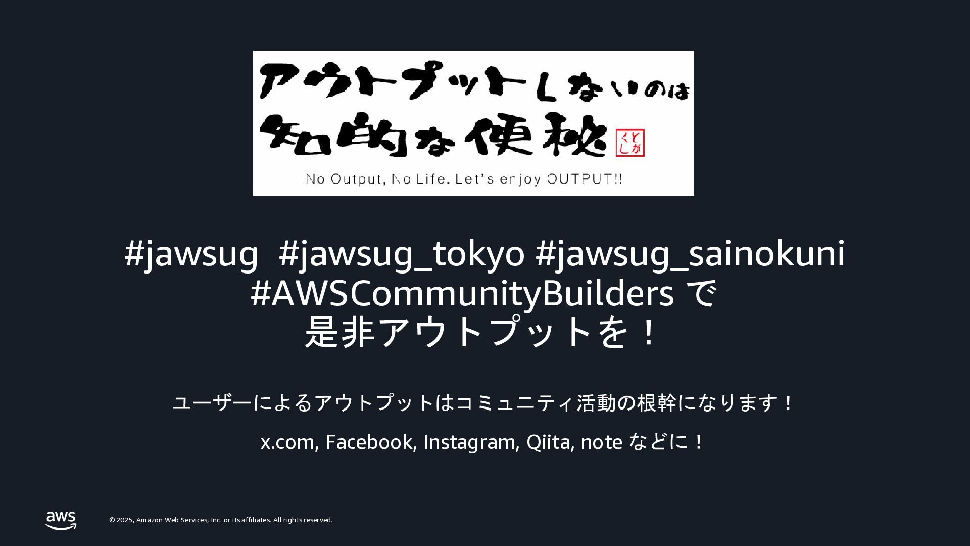 rights reserved. #jawsug #jawsug_tokyo #jawsug_sainokuni #AWSCommunityBuilders で 是非アウトプットを! ユーザーによるアウトプットはコミュニティ活動の根幹になります! x.com, Facebook, Instagram, Qiita, note などに!