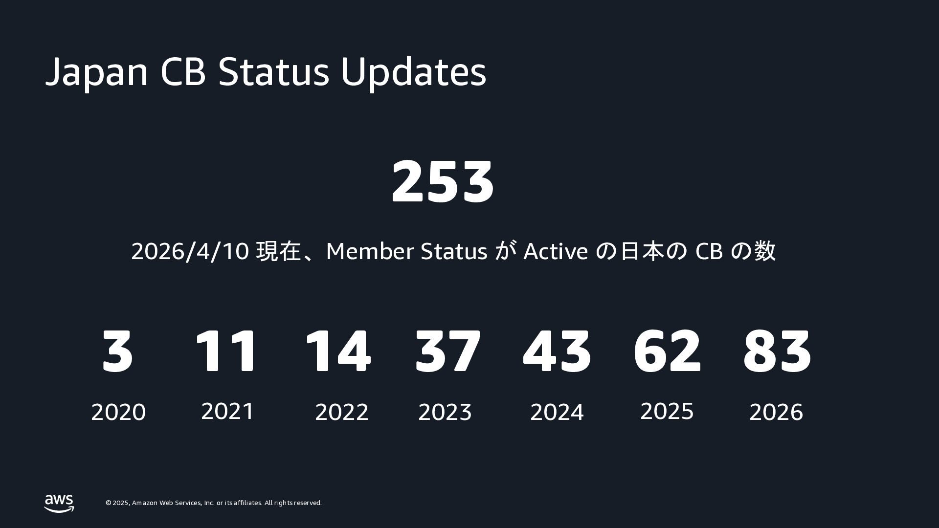 rights reserved. Japan CB Status Updates 253 2026/4/10 現在、Member Status が Active の日本の CB の数 3 11 14 37 43 62 83 2020 2021 2022 2023 2024 2025 2026