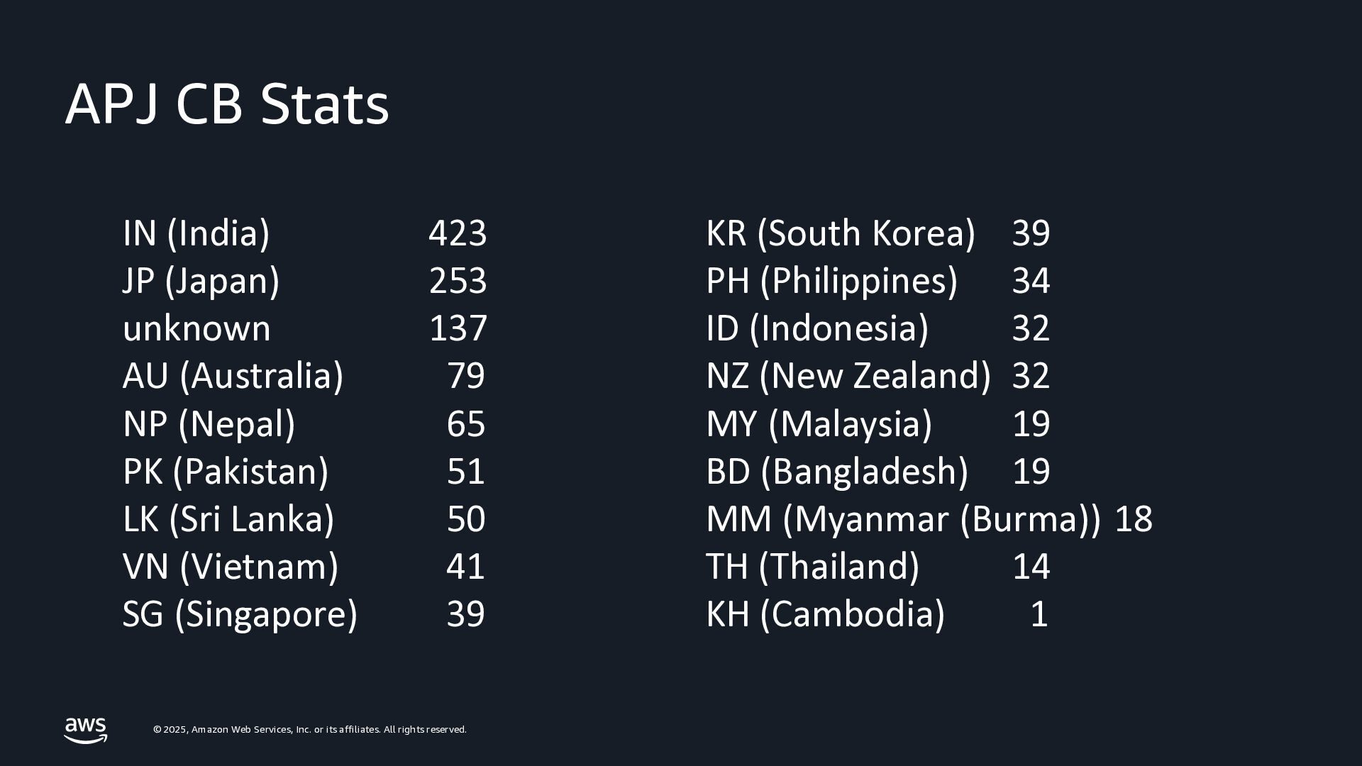 rights reserved. APJ CB Stats IN (India) 423 JP (Japan) 253 unknown 137 AU (Australia) 79 NP (Nepal) 65 PK (Pakistan) 51 LK (Sri Lanka) 50 VN (Vietnam) 41 SG (Singapore) 39 KR (South Korea) 39 PH (Philippines) 34 ID (Indonesia) 32 NZ (New Zealand) 32 MY (Malaysia) 19 BD (Bangladesh) 19 MM (Myanmar (Burma)) 18 TH (Thailand) 14 KH (Cambodia) 1