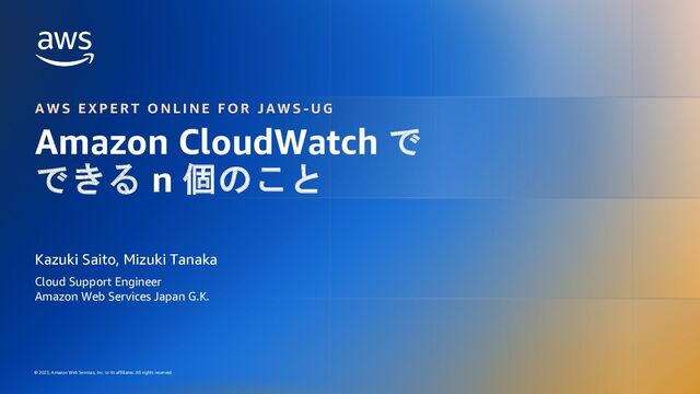 or its affiliates. All rights reserved. 埋め込みメトリクス形式 (Embedded Metric Format, EMF) C L O U D W A T C H M E T R I C S で 高 カ ー デ ィ ナ リ テ ィ に 立 ち 向 か う • CloudWatch Logs にメトリクスを埋め込む • EMF は、この埋め込みの形式を定めるもの • EMF を用いた構造化ログを出力 • → 自動でログから CloudWatch メトリクスを生成 • ログから複雑な分析が可能 • メトリクスは検知のための最小限の利用 • ログは検知された事象に対する詳細分析に利用 • Logs Insights による相関関係の分析 etc.. 追加の属性を 付与可能