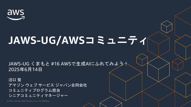 2021, Amazon Web Services, Inc. or its Affiliates. • Have fun • 一人ではできない発見や学び、成長を楽しみたい • Make a difference • 新しいテクノロジーで社会・地域に貢献したい • Go global • 世界中のAWSユーザーと繋がり世界に貢献したい • Find new heroes • コミュニティへの貢献がヒーローを生み出す 参照 JAWS-UGの価値観(ステートメント) https://jaws-ug.jp/about-us/