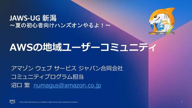 rights reserved. Amazon Confidential and Trademark. © 2022, Amazon Web Services, Inc. or its affiliates. All rights reserved. Amazon Confidential and Trademark. AWSの地域ユーザーコミュニティ 1 アマゾン ウェブ サービス ジャパン合同会社 コミュニティプログラム担当 沼口 繁