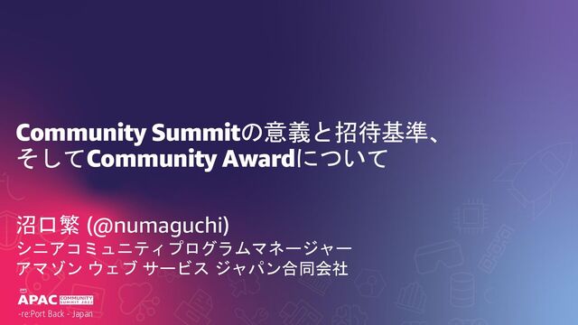 Yamaguchi Winner! (AWS Community HERO, JAWS-UG Chiba and JAWS Event) JAWS DAYS 2021で過去最大 3,945人となったオンラインイベントをリード、JAWS DAYS 2020さ らに2021にも実行委員として貢献している 5. AWS Community Builder of the Year: Shiomi Sumi (AWS Startup Community) AWS Startup Communityを他のメンバーとともに16回開催、今年も4回開催。Twitterでの Follower数は4,606で、平均320tweets/月。JAWS Events にもスピーカーとして登壇 6. User Group of the Year: Hirokazu Hatano (JAWS-UG CLI and JAWS Office) 世界で最多の勉強会実績。彼の右にでるものなし。2022年で26回、1,537人をあつめ、2021年 では73回、4,344人に勉強会を提供。勉強会で利用した300以上の手順書を公開している。