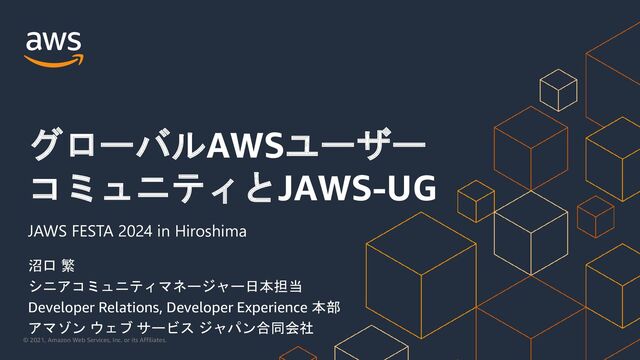 2024年10月12日(土) JAWS FESTA 2024 広島での AWSジャパン枠での登壇資料です。グローバルで推進する5つのコミュニティプログラムと日本で活動するJAWS-UGの概要を学びます。