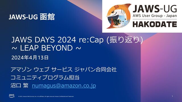 rights reserved. Amazon Confidential and Trademark. © 2022, Amazon Web Services, Inc. or its affiliates. All rights reserved. Amazon Confidential and Trademark. JAWS DAYS 2024 re:Cap (振り返り) ~ LEAP BEYOND ~ 1 アマゾン ウェブ サービス ジャパン合同会社 コミュニティプログラム担当 沼口 繁
