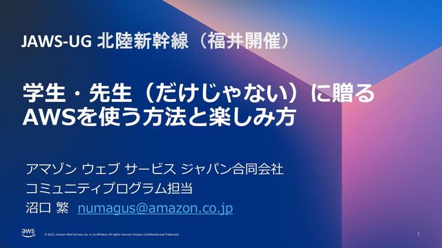 rights reserved. Amazon Confidential and Trademark. © 2022, Amazon Web Services, Inc. or its affiliates. All rights reserved. Amazon Confidential and Trademark. 学生・先生(だけじゃない)に贈る AWSを使う方法と楽しみ方 1 アマゾン ウェブ サービス ジャパン合同会社 コミュニティプログラム担当 沼口 繁
