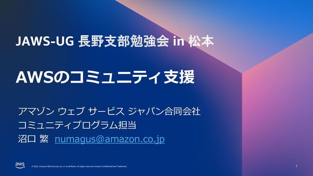 rights reserved. Amazon Confidential and Trademark. © 2022, Amazon Web Services, Inc. or its affiliates. All rights reserved. Amazon Confidential and Trademark. AWSのコミュニティ支援 1 アマゾン ウェブ サービス ジャパン合同会社 コミュニティプログラム担当 沼口 繁