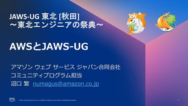 rights reserved. Amazon Confidential and Trademark. © 2022, Amazon Web Services, Inc. or its affiliates. All rights reserved. Amazon Confidential and Trademark. AWSとJAWS-UG 1 アマゾン ウェブ サービス ジャパン合同会社 コミュニティプログラム担当 沼口 繁