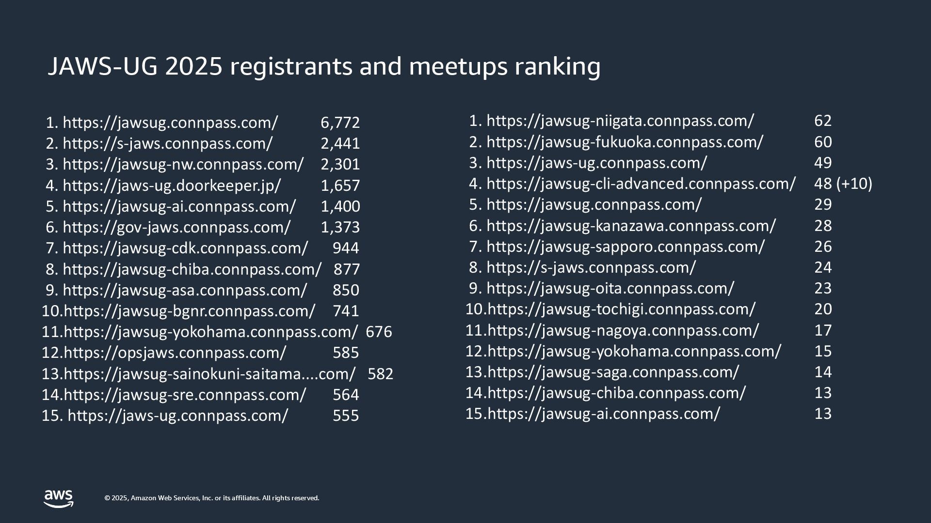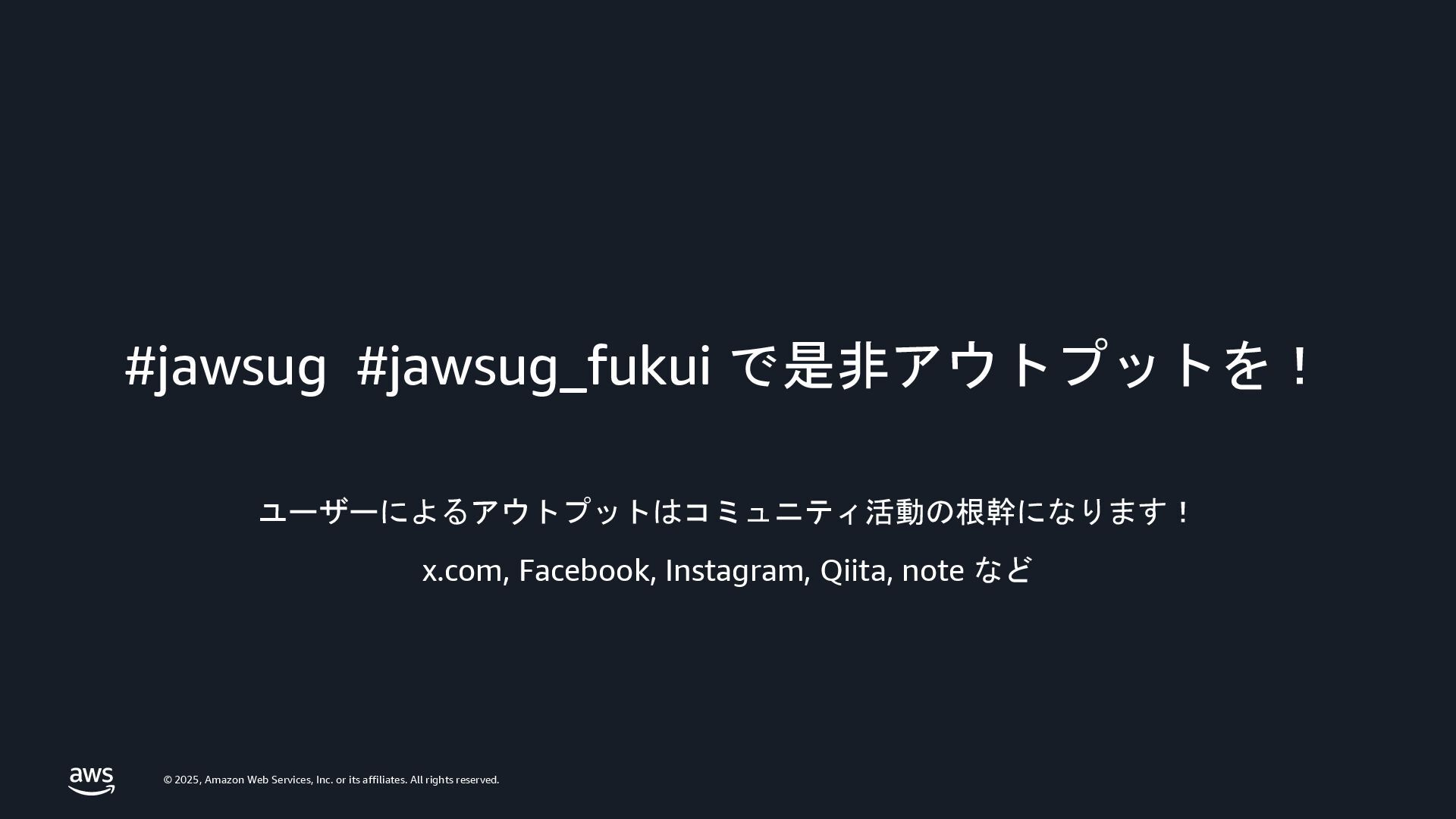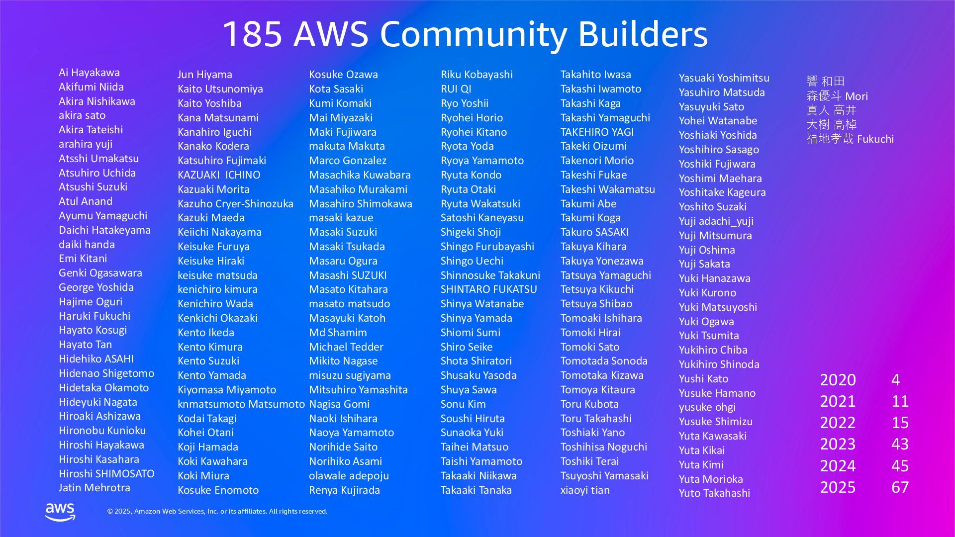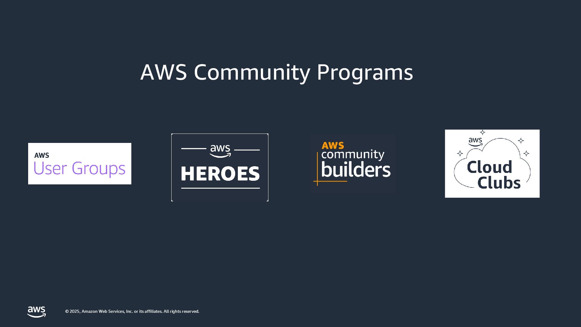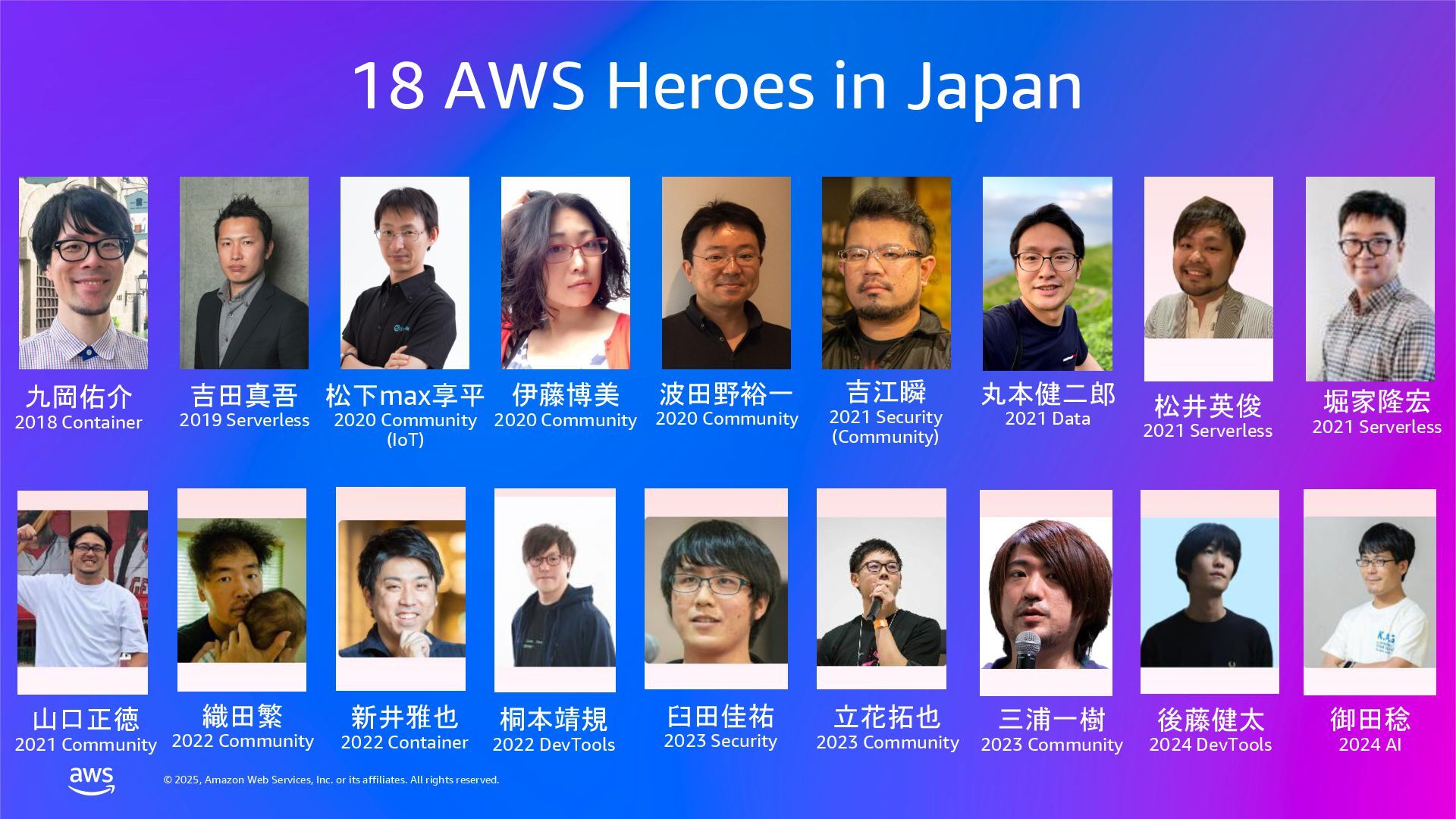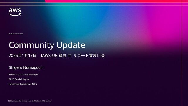 rights reserved. AWS コミュニティの re:Invent ユーザー支援 AWS Community プログラムベースで Developer Experiences がリードします AWS Heroes プログラム AWS Community Builders プログラム AWS User Group Leaders プログラム AWS Cloud Club Captains プログラム Taylor Jacobson Jason Dunn Maria Encinar Lisa Bagley APJC Regional Community Manager / Developer Advocate Shigeru Numaguchi Yoshi Yamaguchi