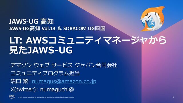 rights reserved. Amazon Confidential and Trademark. © 2021, Amazon Web Services, Inc. or its Affiliates. 9,293 12,424 15,631 18,495 26,124 21,833 12,152 268 255 315 208 376 398 263 0 50 100 150 200 250 300 350 400 450 0 5,000 10,000 15,000 20,000 25,000 30,000 2017 2018 2019 2020 2021 2022 2023Aug AWS User Group Japan 勉強会と参加申込者数 参加者数 開催回数