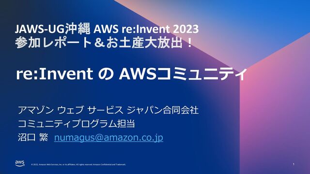 rights reserved. Amazon Confidential and Trademark. © 2022, Amazon Web Services, Inc. or its affiliates. All rights reserved. Amazon Confidential and Trademark. re:Invent の AWSコミュニティ 1 アマゾン ウェブ サービス ジャパン合同会社 コミュニティプログラム担当 沼口 繁