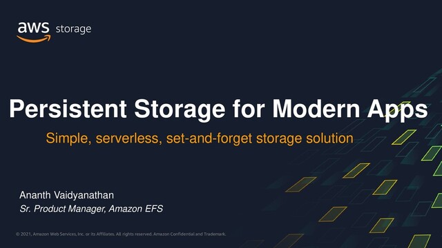 Development teams are modernizing their applications by adopting containers, serverless, and microservices-based architectures. Because containers are transient in nature, long-running applications can benefit from keeping state in durable storage. Distributed applications like machine learning training, and web serving, benefit from a shared storage layer. Amazon Elastic File System (Amazon EFS) is a simple, scalable, fully managed, elastic, cloud native shared file system, enabling you to build modern applications, persist and share data from your AWS containers and serverless applications, with zero management required.