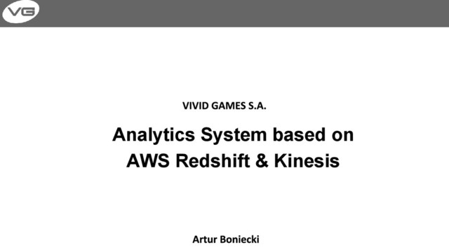 advanced, independent development studio in Europe, and the biggest producer of mobile games in Poland, ◦ over 160 projects for smartphones and mobile devices with two best known brands: Real Boxing & GodFire, now prepare for Real Boxing 2… coming soon. • Artur Boniecki ◦ Head of R&D Department at Vivid Games S.A., previously was working 14 years for Alcatel-Lucent, ◦ involved in a project related to processing of large quantities of data identifying devices, traits and behavior of gamers and analysis of collected data.