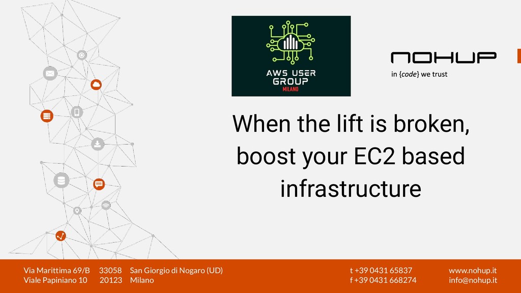 Papiniano 10 20123 Milano t +39 0431 65837 f +39 0431 668274 www.nohup.it [email protected] When the lift is broken, boost your EC2 based infrastructure