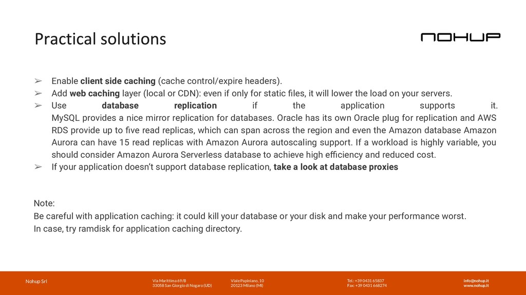 69/B 33058 San Giorgio di Nogaro (UD) [email protected] www.nohup.it Tel.: +39 0431 65837 Fax: +39 0431 668274 ➢ Enable client side caching (cache control/expire headers). ➢ Add web caching layer (local or CDN): even if only for static files, it will lower the load on your servers. ➢ Use database replication if the application supports it. MySQL provides a nice mirror replication for databases. Oracle has its own Oracle plug for replication and AWS RDS provide up to five read replicas, which can span across the region and even the Amazon database Amazon Aurora can have 15 read replicas with Amazon Aurora autoscaling support. If a workload is highly variable, you should consider Amazon Aurora Serverless database to achieve high efficiency and reduced cost. ➢ If your application doesn’t support database replication, take a look at database proxies Note: Be careful with application caching: it could kill your database or your disk and make your performance worst. In case, try ramdisk for application caching directory.