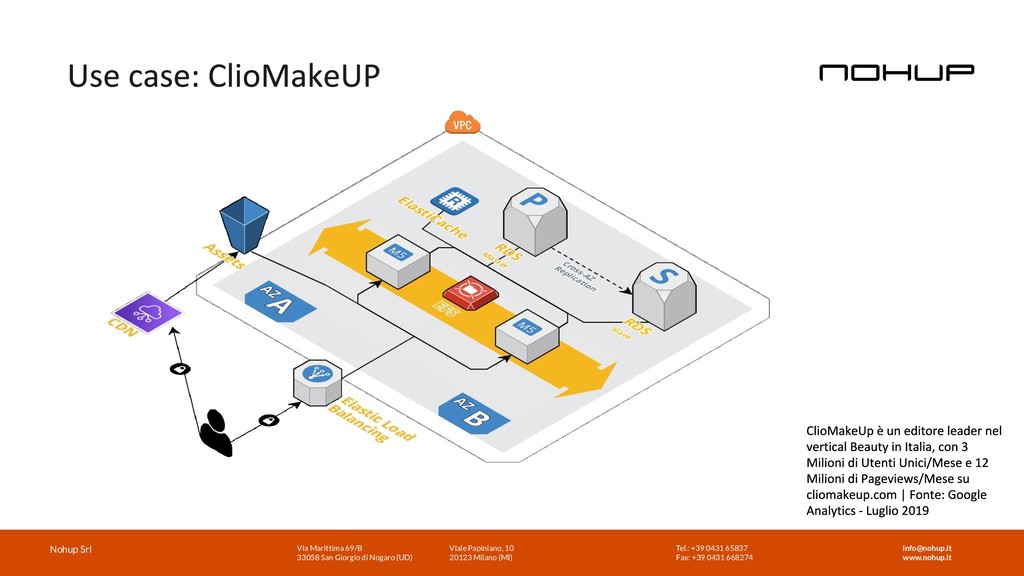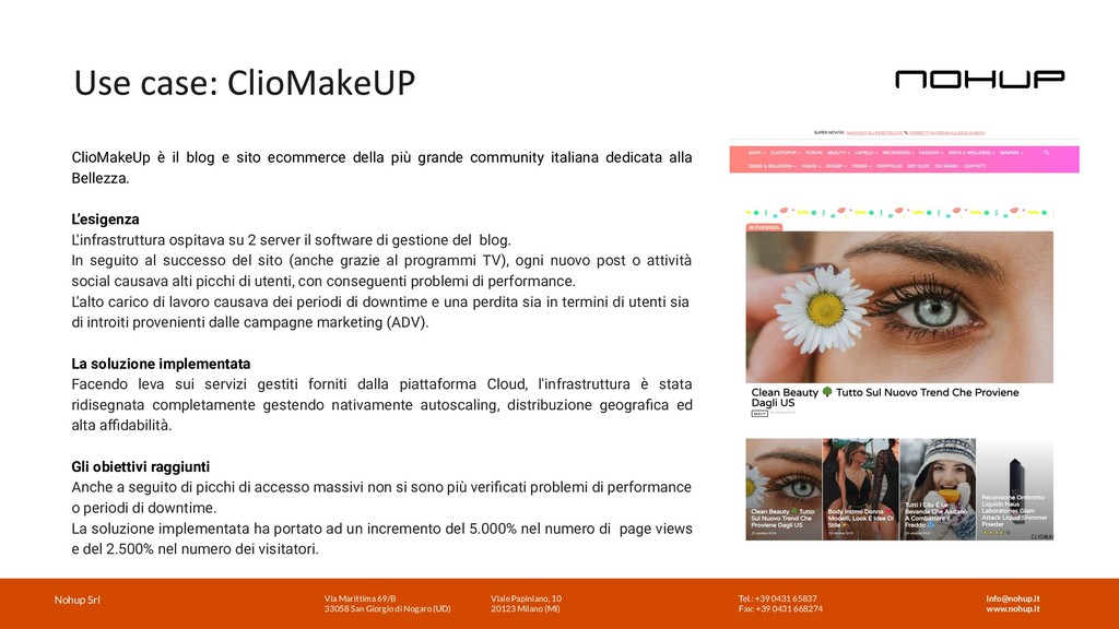 69/B 33058 San Giorgio di Nogaro (UD) [email protected] www.nohup.it Tel.: +39 0431 65837 Fax: +39 0431 668274 ClioMakeUp è il blog e sito ecommerce della più grande community italiana dedicata alla Bellezza. L’esigenza L'infrastruttura ospitava su 2 server il software di gestione del blog. In seguito al successo del sito (anche grazie al programmi TV), ogni nuovo post o attività social causava alti picchi di utenti, con conseguenti problemi di performance. L'alto carico di lavoro causava dei periodi di downtime e una perdita sia in termini di utenti sia di introiti provenienti dalle campagne marketing (ADV). La soluzione implementata Facendo leva sui servizi gestiti forniti dalla piattaforma Cloud, l'infrastruttura è stata ridisegnata completamente gestendo nativamente autoscaling, distribuzione geografica ed alta affidabilità. Gli obiettivi raggiunti Anche a seguito di picchi di accesso massivi non si sono più verificati problemi di performance o periodi di downtime. La soluzione implementata ha portato ad un incremento del 5.000% nel numero di page views e del 2.500% nel numero dei visitatori.