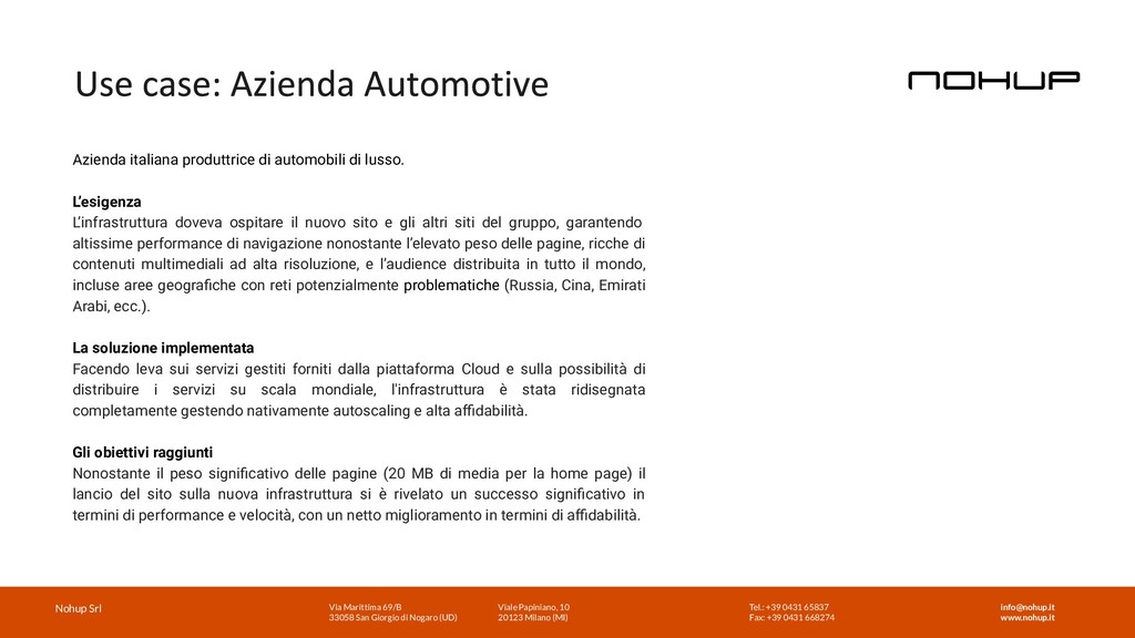 69/B 33058 San Giorgio di Nogaro (UD) [email protected] www.nohup.it Tel.: +39 0431 65837 Fax: +39 0431 668274 Azienda italiana produttrice di automobili di lusso. L’esigenza L’infrastruttura doveva ospitare il nuovo sito e gli altri siti del gruppo, garantendo altissime performance di navigazione nonostante l’elevato peso delle pagine, ricche di contenuti multimediali ad alta risoluzione, e l’audience distribuita in tutto il mondo, incluse aree geografiche con reti potenzialmente problematiche (Russia, Cina, Emirati Arabi, ecc.). La soluzione implementata Facendo leva sui servizi gestiti forniti dalla piattaforma Cloud e sulla possibilità di distribuire i servizi su scala mondiale, l'infrastruttura è stata ridisegnata completamente gestendo nativamente autoscaling e alta affidabilità. Gli obiettivi raggiunti Nonostante il peso significativo delle pagine (20 MB di media per la home page) il lancio del sito sulla nuova infrastruttura si è rivelato un successo significativo in termini di performance e velocità, con un netto miglioramento in termini di affidabilità.