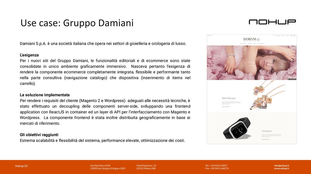 69/B 33058 San Giorgio di Nogaro (UD) [email protected] www.nohup.it Tel.: +39 0431 65837 Fax: +39 0431 668274 Damiani S.p.A. è una società italiana che opera nei settori di gioielleria e orologeria di lusso. L’esigenza Per i nuovi siti del Gruppo Damiani, le funzionalità editoriali e di ecommerce sono state consolidate in unico ambiente graficamente immersivo. Nasceva pertanto l’esigenza di rendere la componente ecommerce completamente integrata, flessibile e performante tanto nella parte consultiva (navigazione catalogo) che dispositiva (inserimento di items nel carrello). La soluzione implementata Per rendere i requisiti del cliente (Magento 2 e Wordpress) adeguati alle necessità tecniche, è stato effettuato un decoupling delle componenti server-side, sviluppando una frontend application con ReactJS in container ed un layer di API per l’interfacciamento con Magento e Wordpress. La componente frontend è stata inoltre distribuita geograficamente in base ai mercati di riferimento. Gli obiettivi raggiunti Estrema scalabilità e flessibilità del sistema, performance elevate, ottimizzazione dei costi.