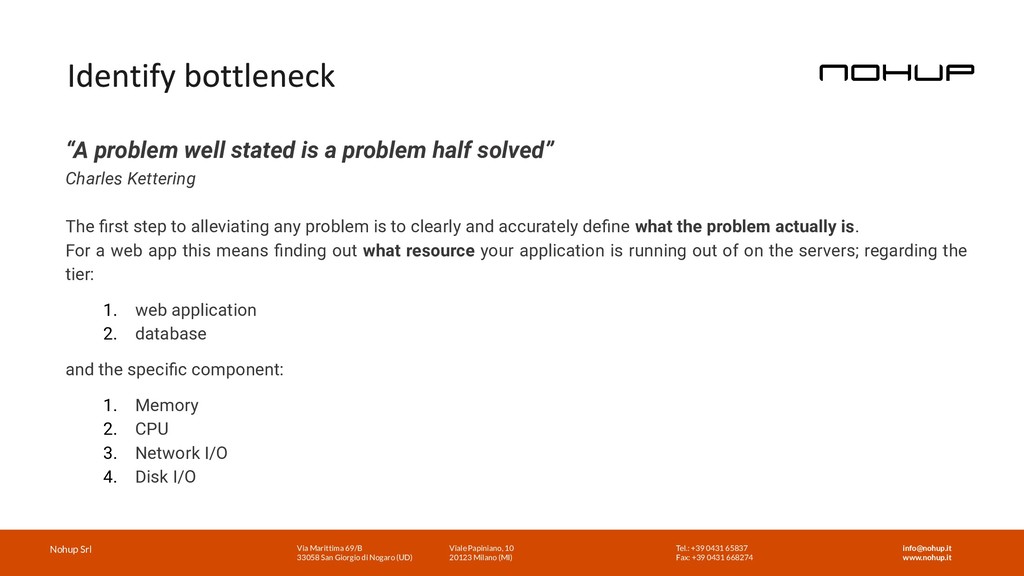 69/B 33058 San Giorgio di Nogaro (UD) [email protected] www.nohup.it Tel.: +39 0431 65837 Fax: +39 0431 668274 “A problem well stated is a problem half solved” Charles Kettering The first step to alleviating any problem is to clearly and accurately define what the problem actually is. For a web app this means finding out what resource your application is running out of on the servers; regarding the tier: 1. web application 2. database and the specific component: 1. Memory 2. CPU 3. Network I/O 4. Disk I/O