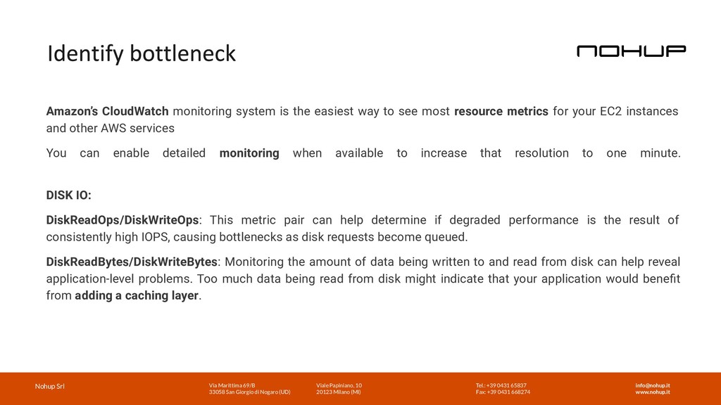 69/B 33058 San Giorgio di Nogaro (UD) [email protected] www.nohup.it Tel.: +39 0431 65837 Fax: +39 0431 668274 Amazon’s CloudWatch monitoring system is the easiest way to see most resource metrics for your EC2 instances and other AWS services You can enable detailed monitoring when available to increase that resolution to one minute. DISK IO: DiskReadOps/DiskWriteOps: This metric pair can help determine if degraded performance is the result of consistently high IOPS, causing bottlenecks as disk requests become queued. DiskReadBytes/DiskWriteBytes: Monitoring the amount of data being written to and read from disk can help reveal application-level problems. Too much data being read from disk might indicate that your application would benefit from adding a caching layer.