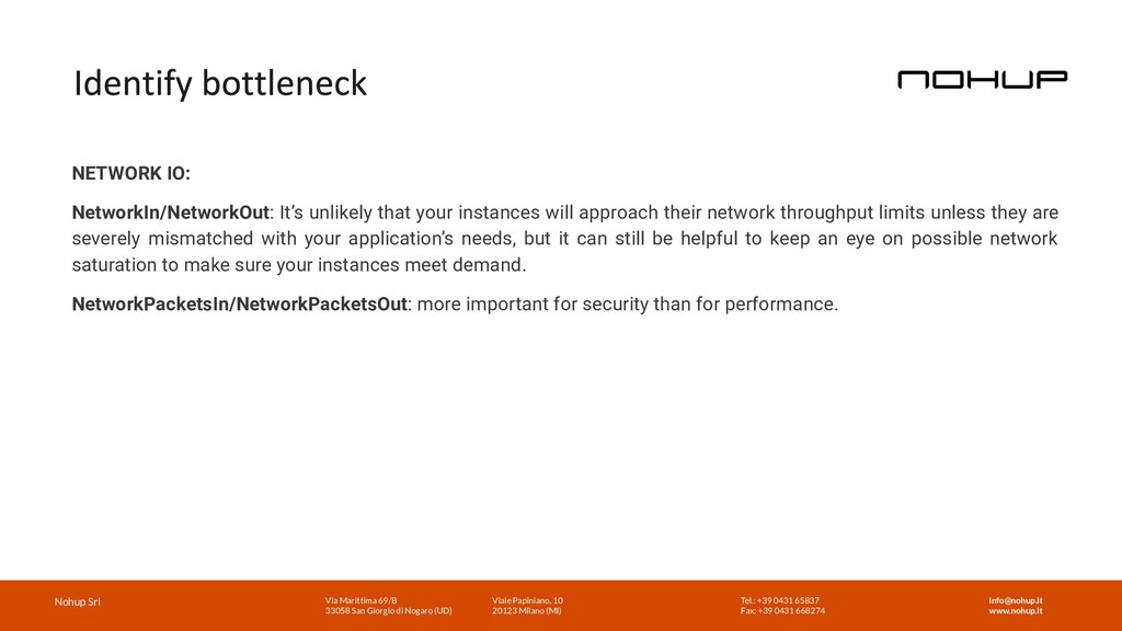69/B 33058 San Giorgio di Nogaro (UD) [email protected] www.nohup.it Tel.: +39 0431 65837 Fax: +39 0431 668274 NETWORK IO: NetworkIn/NetworkOut: It’s unlikely that your instances will approach their network throughput limits unless they are severely mismatched with your application’s needs, but it can still be helpful to keep an eye on possible network saturation to make sure your instances meet demand. NetworkPacketsIn/NetworkPacketsOut: more important for security than for performance.