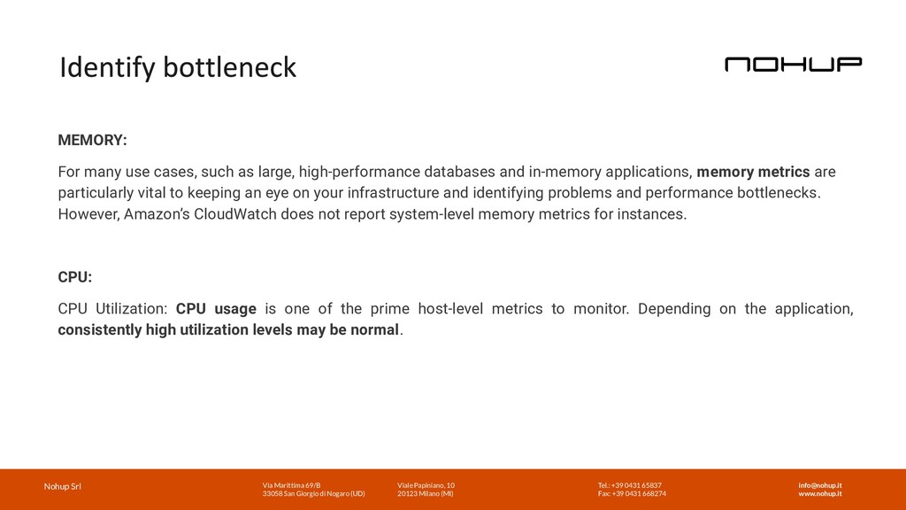 69/B 33058 San Giorgio di Nogaro (UD) [email protected] www.nohup.it Tel.: +39 0431 65837 Fax: +39 0431 668274 MEMORY: For many use cases, such as large, high-performance databases and in-memory applications, memory metrics are particularly vital to keeping an eye on your infrastructure and identifying problems and performance bottlenecks. However, Amazon’s CloudWatch does not report system-level memory metrics for instances. CPU: CPU Utilization: CPU usage is one of the prime host-level metrics to monitor. Depending on the application, consistently high utilization levels may be normal.