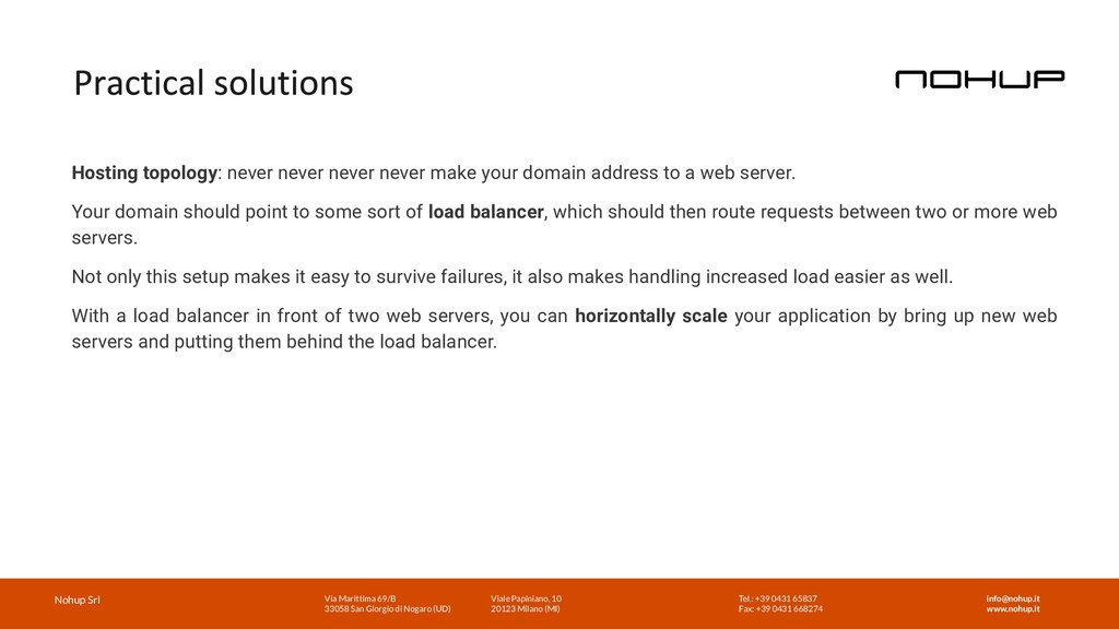 69/B 33058 San Giorgio di Nogaro (UD) [email protected] www.nohup.it Tel.: +39 0431 65837 Fax: +39 0431 668274 Hosting topology: never never never never make your domain address to a web server. Your domain should point to some sort of load balancer, which should then route requests between two or more web servers. Not only this setup makes it easy to survive failures, it also makes handling increased load easier as well. With a load balancer in front of two web servers, you can horizontally scale your application by bring up new web servers and putting them behind the load balancer.