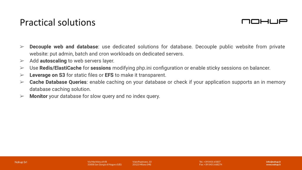 69/B 33058 San Giorgio di Nogaro (UD) [email protected] www.nohup.it Tel.: +39 0431 65837 Fax: +39 0431 668274 ➢ Decouple web and database: use dedicated solutions for database. Decouple public website from private website: put admin, batch and cron workloads on dedicated servers. ➢ Add autoscaling to web servers layer. ➢ Use Redis/ElastiCache for sessions modifying php.ini configuration or enable sticky sessions on balancer. ➢ Leverage on S3 for static files or EFS to make it transparent. ➢ Cache Database Queries: enable caching on your database or check if your application supports an in memory database caching solution. ➢ Monitor your database for slow query and no index query.