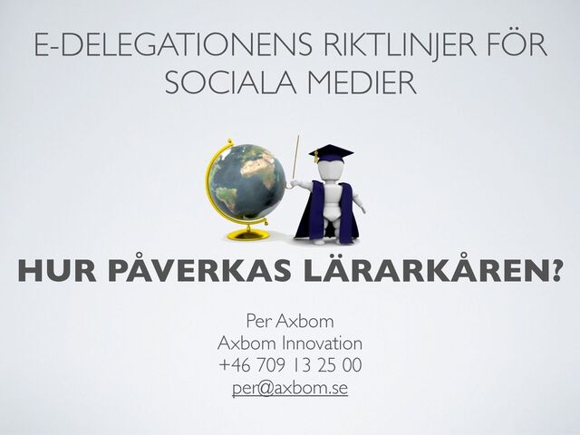 Kartlägg nuvarande och önskad användning Inte bara verktyg, utan hur man vill jobba, vilken flexibilitet som behövs för att vara konkurrenskraftig... Inte bara med lärarkåren utan med elever, andra myndigheter, m.m. Tillämpningsbeslut för gallring! Rutiner för: läsa, bedöma & informera om användaravtal Rutiner för bevakning / arkivering / exit Nätverk för erfautbyte / best practice Skapa eget Följ @Edelegationen på Twitter! Gå med i http://edelegationen.ning.com/ Underlättar att sålla bort irrelevanta och kränkande kommentarer. Resurskrävande Skapa en wiki där alla, såväl lärare som elever (och utomstående) kan bidra med insikter.
