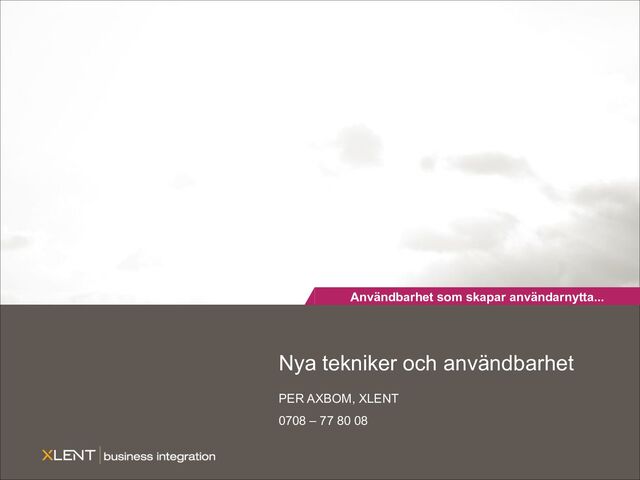 publication may be reproduced, stored in a retrieval system, or transmitted in any form or by any means - electronic, mechanical, photocopying, recording, or otherwise - without the permission of XLENT. This document provides an outline of a presentation and is incomplete without the accompanying oral commentary and discussion. Frågor på det? Per Axbom [email protected] 0708-77 80 08