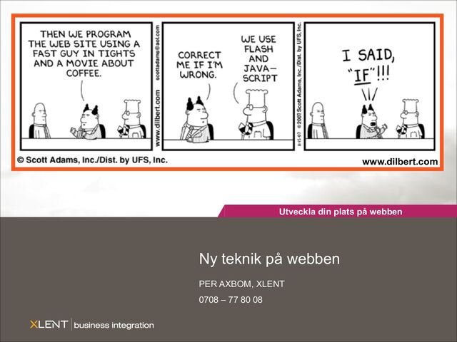 publication may be reproduced, stored in a retrieval system, or transmitted in any form or by any means - electronic, mechanical, photocopying, recording, or otherwise - without the permission of XLENT. This document provides an outline of a presentation and is incomplete without the accompanying oral commentary and discussion. Frågor på det? Per Axbom