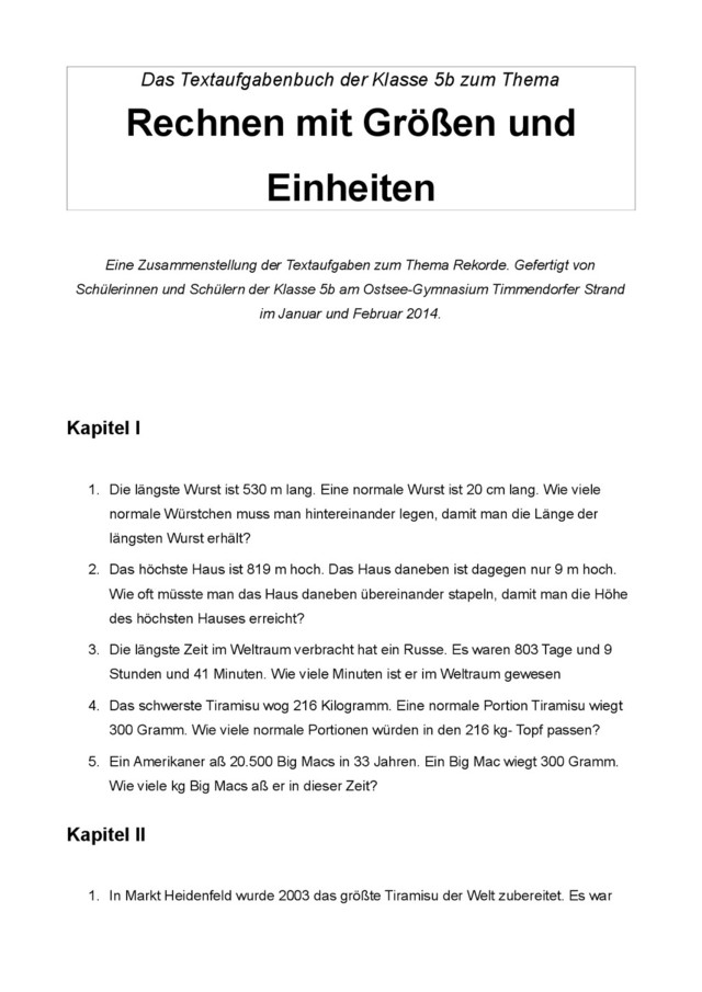 Im Rahmen des Themas Rechnen mit Einheiten und Größen hat die Klasse 5b ein eigenes Mathebuch entworfen! Die Aufgaben haben die Schülerinnen und Schüler selbst ausgedacht, gegenseitig überprüft und illustriert. Grundlage war eine Sammlung von beeindruckenden wie auch humorvollen Rekorden. Wie viele Menschen können wohl von einer 530 m langen Wurst satt werden? Wie viel länger ist die längste Nase der Welt (19,05 cm) als die eigene? Wie oft passt die Fläche Deutschlands in die größte Trockenwüste der Welt, der Sahara rein? Unter Anleitung von Herrn Egtvde und Herrn Müller (Praktikant)