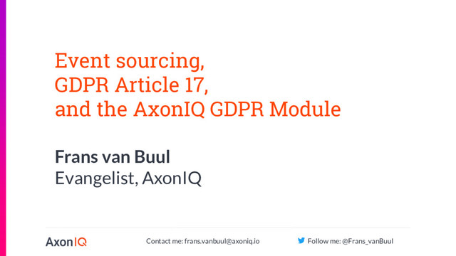 The AxonIQ GDPR module ensures that personal data within events is stored in an encrypted form. The encryption keys are automatically generated and are unique to the data subject or the aggregate identifer. The module provides an API to delete this key afterwards. Deletion of this key is equivalent to deleting the personal data fields itself, but doesn’t require any changes to the list of past events. This solves the problem of erasing data in an immutable event list.