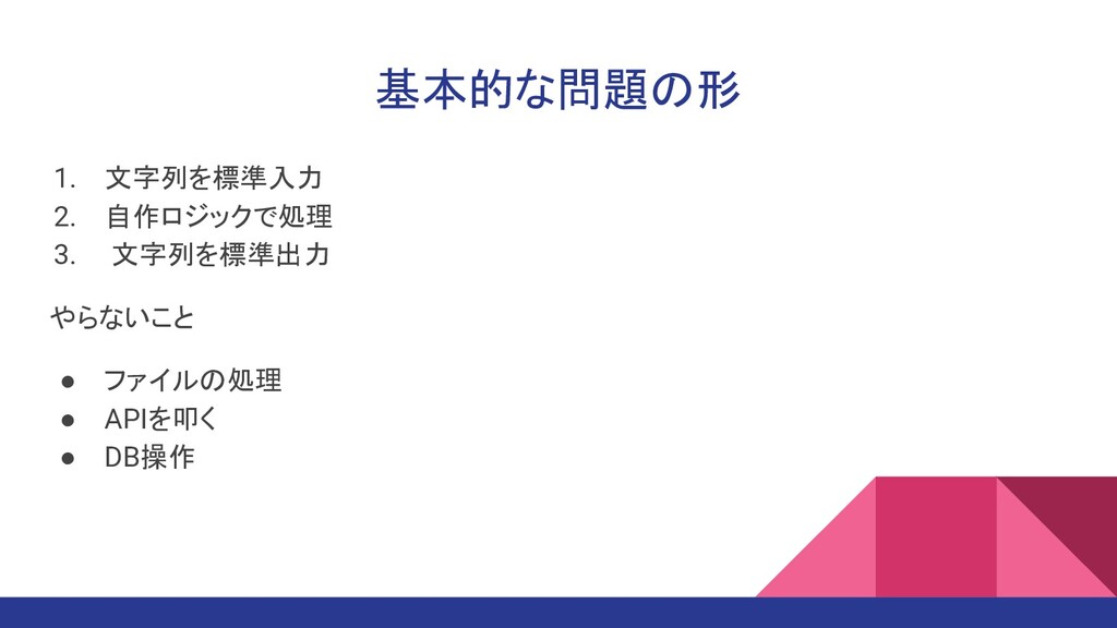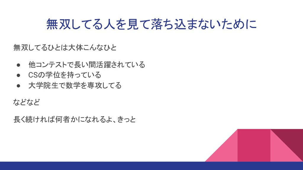 • WA (Wrong Answer) ◦ テストケースを増やしてデバッグ。 • TLE (Time Limit Exceeded) ◦ 時間の掛かってそうな箇所を方針レベルで見直す。 ◦ 些細なことが影響していると疑わない ▪ VectorとArrayで処理速度が変わるとか • IE (Internal Error) ◦ 最近はジャッジに時間がかかって unrated • MLE (Memory Limit Exceeded), OLE (Output Limit Exceeded) ◦ 遭遇したことない...