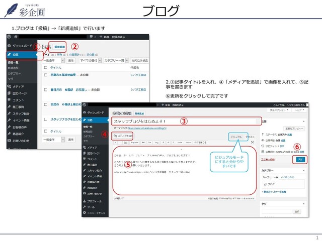 ブログ ① ② 1.ブログは「投稿」→「新規追加」で行います 2.③記事タイトルを入れ、④「メディアを追加」で画像を入れて、⑤記 事を書きます ⑥更新をクリックして完了です ③ ④ ⑤