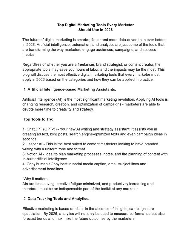 The future of digital marketing is smarter, faster and more data-driven than ever before in 2026. Artificial intelligence, automation, and analytics are just some of the tools that are transforming the way marketers engage audiences, campaigns, and success metrics. Regardless of whether you are a freelancer, brand strategist, or content creator, the appropriate tools may save you hours of labor, and the impacts may be the most. This blog will discuss the most effective digital marketing tools that every marketer must apply in 2026 based on the categories and how they can be applied in practice. 1. Artificial Intelligence-based Marketing Assistants. Artificial intelligence (AI) is the most significant marketing revolution. Applying AI tools is changing research, creation, and optimization of campaigns - marketers are able to devote more time to creativity and strategy. Top Tools to Try: 1. ChatGPT (GPT-5) - Your new AI writing and strategy assistant. It assists you in creating ad text, blog posts, search engine-optimized texts and even campaign ideas in seconds. 2. Jasper AI - This is the best suited to content marketers looking to have branded writing with a uniform tone and format. 3. Notion AI - Ideal to plan marketing processes, notes, and the planning of content with in-built artificial intelligence. 4. Copy.human|>Copy.best in social media caption, email subject lines and advertisement headlines. Why it matters: AIs are time-saving, creative fatigue minimized, and productivity increasing and, therefore, must be an indispensable part of the toolkit of any marketer. 2. Data Tracking Tools and Analytics. Effective marketing is based on data. In the absence of insights, campaigns are speculation. By 2026, analytics will not only be used to measure performance but also forecast trends and maximize the future outcomes by the marketers.