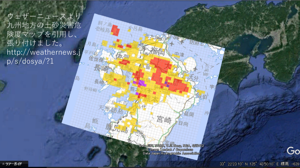 ウェザーニュースより 九州地⽅の⼟砂災害危 険度マップを引⽤し、 張り付けました。 http://weathernews.j p/s/dosya/?1