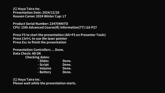 Winter Cup: LT Product Serial Number: 234704NITO CPU: 15th Advanced Course(R) Information(TT) i18-P27 Press F5 to start the presentation (Alt+F5 on Presenter Tools) Press Ctrl+L to use the laser pointer Press Esc to finish the presentation Presentation Controllers ... Done. Data Check: All OK Checking dates: - Slides Done. - Script Done. - Volume Done. - Battery Done. (C) Koya Taira Inc. Please wait while the presentation starts.