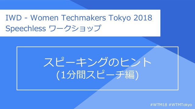 non erat sem スピーチした人に対して、聞いていた人が どうすれば最善の対策ができるか前向きに伝える • 問題ではなく解決策に焦点を当てる • 実践できるアイディアを出す • その人固有の問題として捉えない ※アイディアに対して評価や反論しないようにする #WTM18 #WTMTokyo Tip 3 – Feedforward Let’s Try!