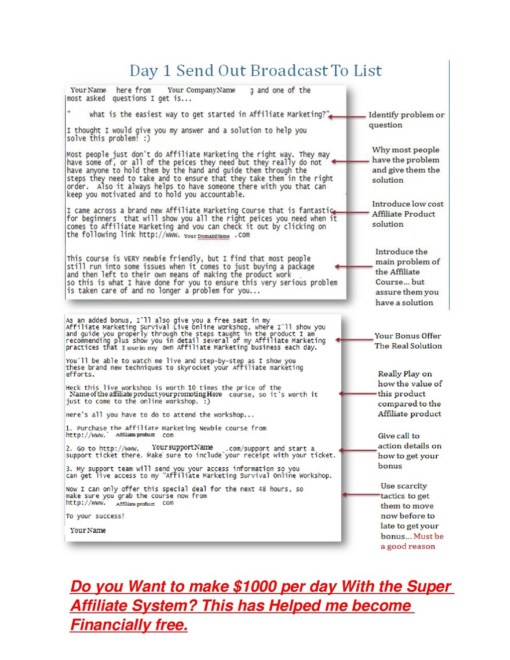 Rights product in the Niche that you have chosen, and that will make sense to become a bonus, or create it from the content of the Affiliate product you are promoting. Create a 2-4 module Online training Course that will walk the customer that buys your Affiliate product by the hand through the step by step process of learning the Niche Topic you are an Affiliate for. Note: Bonus Offer does not need to be completely ready. It becomes a product that you are going to create as you go. You will deliver this workshop live through inviting those that by the Affiliate product to show up to your live workshop trainings. Of course it is possible to have this already recorded so that you can deliver the workshop through the use of video recordings. 3. Write an email and a blog post that are very similar in content. The email you will be sending out on day one of the promotion. The blog post is going to be where you will be sending them on day two of the promotion. One option to consider is the use of video on the blog instead written content for higher conversion. 4. Begin the marketing process by sending out the very first email. You will notice in the diagrams I have provide I show you exactly what should be included in your email that you will be sending out. This same content will be place on your blog either through written content or video.