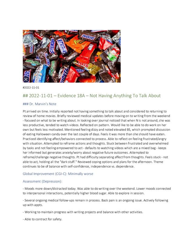 Pt arrived on time. Initially reported not having something to talk about and considered to returning to review of home movies. Briefly reviewed medical updates before moving on to writing from the weekend - focused on what to be writing about. In looking over journal noticed that when N is not around, she was less productive, tended to watch videos. Reflected on pattern. Would like to be able to do work on her own but feels less motivated. Mentioned feeling dizzy and noted elevated BS, which prompted discussion of eating Halloween candy over the last couple of days. Feels it was more than she should have eaten. Practiced identifying affect/behaviors connected to process. Able to reflect on feeling frustrated/angry with situation. Attempted to reframe actions and thoughts. Stuck between frustrated and overwhelmed by tasks and not feeling empowered to act - defaults to watching videos which are a mixed bag - keeps her informed but generates anxiety/worry about negative future outcomes. Attempted to reframe/challenge negative thoughts. Pt had difficulty separating affect from thoughts. Feels stuck - not able to act, holding all the "dark stuff." Reviewed coping options and plans for the afternoon. Theme continues to be of balance with self-confidence, independence vs. dependence.