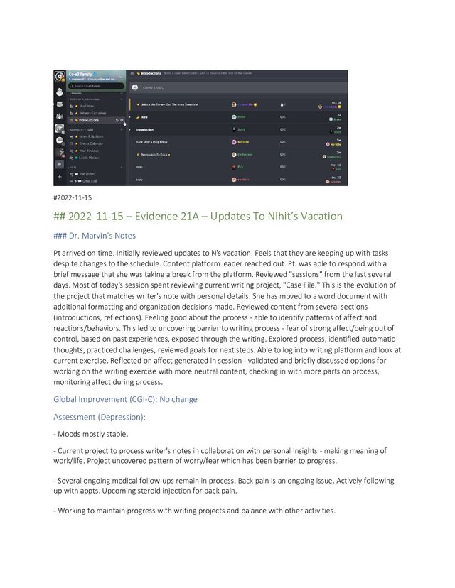 Pt arrived on time. Initially reviewed updates to N's vacation. Feels that they are keeping up with tasks despite changes to the schedule. Content platform leader reached out. Pt. was able to respond with a brief message that she was taking a break from the platform. Reviewed "sessions" from the last several days. Most of today's session spent reviewing current writing project, "Case File." This is the evolution of the project that matches writer's note with personal details. She has moved to a word document with additional formatting and organization decisions made. Reviewed content from several sections (introductions, reflections). Feeling good about the process - able to identify patterns of affect and reactions/behaviors. This led to uncovering barrier to writing process - fear of strong affect/being out of control, based on past experiences, exposed through the writing. Explored process, identified automatic thoughts, practiced challenges, reviewed goals for next steps. Able to log into writing platform and look at current exercise. Reflected on affect generated in session - validated and briefly discussed options for working on the writing exercise with more neutral content, checking in with more parts on process, monitoring affect during process.