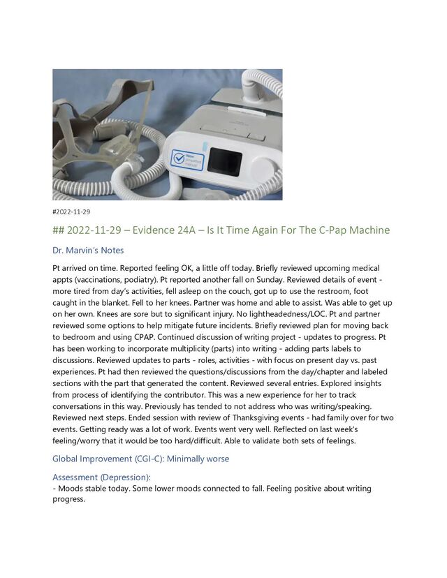 Pt arrived on time. Reported feeling OK, a little off today. Briefly reviewed upcoming medical appts (vaccinations, podiatry). Pt reported another fall on Sunday. Reviewed details of event - more tired from day’s activities, fell asleep on the couch, got up to use the restroom, foot caught in the blanket. Fell to her knees. Partner was home and able to assist. Was able to get up on her own. Knees are sore but to significant injury. No lightheadedness/LOC. Pt and partner reviewed some options to help mitigate future incidents. Briefly reviewed plan for moving back to bedroom and using CPAP. Continued discussion of writing project - updates to progress. Pt has been working to incorporate multiplicity (parts) into writing - adding parts labels to discussions. Reviewed updates to parts - roles, activities - with focus on present day vs. past experiences. Pt had then reviewed the questions/discussions from the day/chapter and labeled sections with the part that generated the content. Reviewed several entries. Explored insights from process of identifying the contributor. This was a new experience for her to track conversations in this way. Previously has tended to not address who was writing/speaking. Reviewed next steps. Ended session with review of Thanksgiving events - had family over for two events. Getting ready was a lot of work. Events went very well. Reflected on last week's feeling/worry that it would be too hard/difficult. Able to validate both sets of feelings.