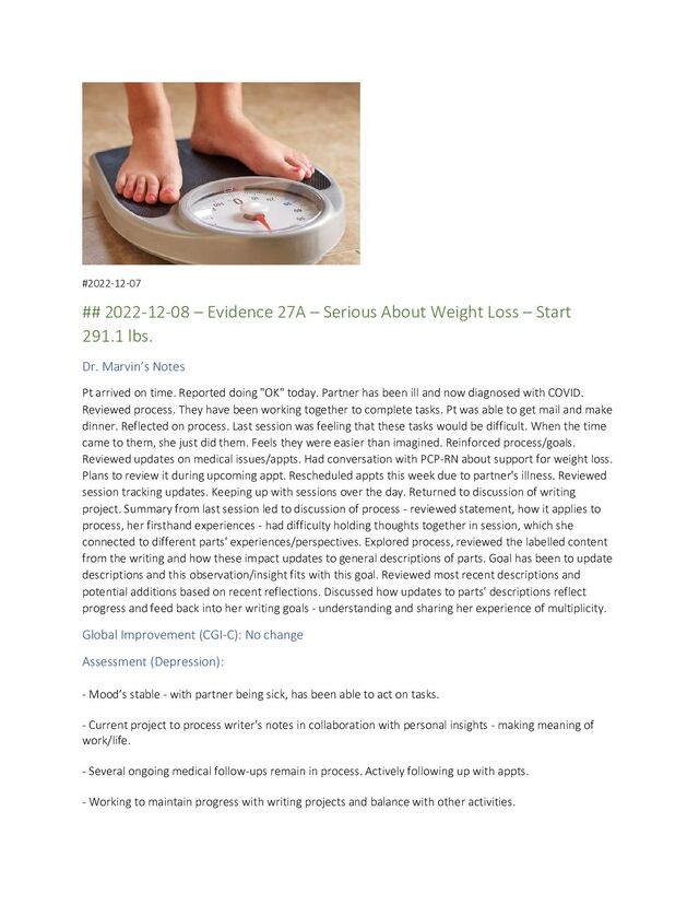 Pt arrived on time. Reported doing "OK" today. Partner has been ill and now diagnosed with COVID. Reviewed process. They have been working together to complete tasks. Pt was able to get mail and make dinner. Reflected on process. Last session was feeling that these tasks would be difficult. When the time came to them, she just did them. Feels they were easier than imagined. Reinforced process/goals. Reviewed updates on medical issues/appts. Had conversation with PCP-RN about support for weight loss. Plans to review it during upcoming appt. Rescheduled appts this week due to partner's illness. Reviewed session tracking updates. Keeping up with sessions over the day. Returned to discussion of writing project. Summary from last session led to discussion of process - reviewed statement, how it applies to process, her firsthand experiences - had difficulty holding thoughts together in session, which she connected to different parts' experiences/perspectives. Explored process, reviewed the labelled content from the writing and how these impact updates to general descriptions of parts. Goal has been to update descriptions and this observation/insight fits with this goal. Reviewed most recent descriptions and potential additions based on recent reflections. Discussed how updates to parts' descriptions reflect progress and feed back into her writing goals - understanding and sharing her experience of multiplicity.